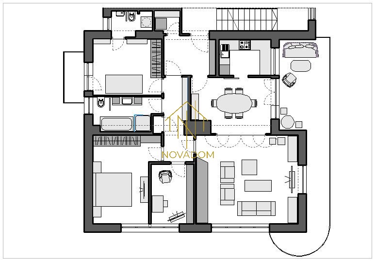 Nekretnina se sastoji od: prostranog hodnika, open space dnevnog boravka s blagovaonom i kuhinjom, lijepom i prostranom terasom s pogledom na zelenilo, 3 spavaće sobe te 2 kupaone s wc-om.